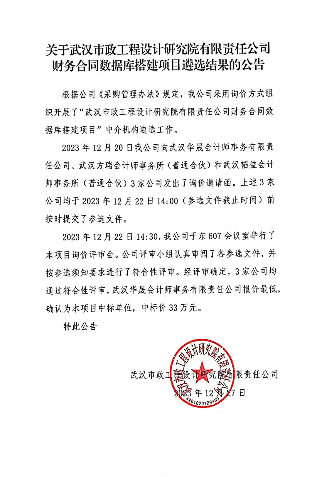 關(guān)于武漢市政工程設(shè)計研究院有限責(zé)任公司財務(wù)合同數(shù)據(jù)庫搭建項目遴選結(jié)果的公告