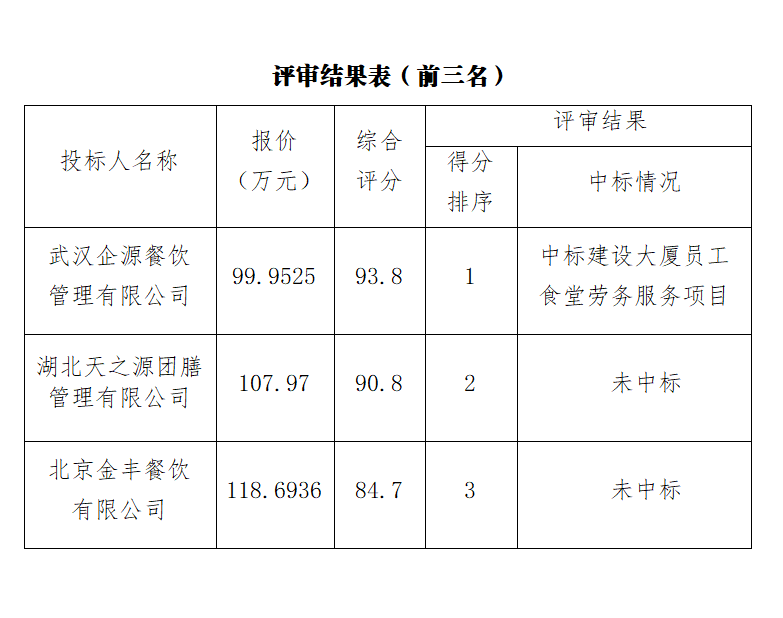 ? ? 經(jīng)評(píng)審,綜合評(píng)分排名第一為武漢企源餐飲管理有限公司,報(bào)價(jià)為99.9525萬(wàn)元/年,綜合評(píng)分為93.8分,中標(biāo)武漢市政工程設(shè)計(jì)研究院有限責(zé)任公司建設(shè)大廈員工食堂勞務(wù)服務(wù)項(xiàng)目。