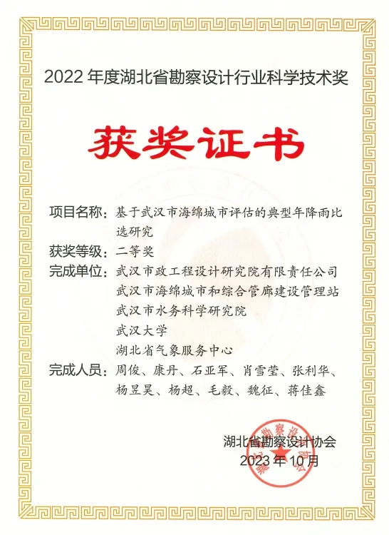 依托“城市內澇防治與水環(huán)境流域治理技術中試平臺”開展的《基于武漢市海綿城市評估的典型年降雨比選研究》獲湖北省勘察設計協(xié)會科學技術二等獎