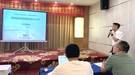 武漢市政院“拾光隧道QC小組”組員龍凡對“地鐵隧道穿越極硬巖的新方案研究”課題進(jìn)行了成果發(fā)布。“拾光隧道QC小組”為解決地鐵隧道穿越極硬巖傳統(tǒng)方法安全難以保證、工作效率較低等痛點(diǎn)問題,研發(fā)了一種地鐵隧道穿越極硬巖的全新技術(shù)方案,攻克了復(fù)雜地質(zhì)和敏感環(huán)境兩大難題。該研究成果在“武漢地鐵12號線港口村站~丁家咀站區(qū)間隧道工程”中,實(shí)現(xiàn)盾構(gòu)穿越極硬巖深孔爆破預(yù)處理在武漢軌道交通地下區(qū)間的首次應(yīng)用。“拾光隧道QC小組”對該創(chuàng)新成果進(jìn)行了標(biāo)準(zhǔn)化建設(shè),形成了通用設(shè)計圖和成套技術(shù)方案,現(xiàn)已在全公司推廣應(yīng)用。