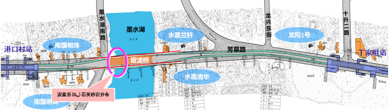 ? ? 超硬巖層、超近下穿。本項(xiàng)目設(shè)計(jì)范圍中的港口村站~丁家咀站區(qū)間隧道長(zhǎng)約1242m,采用盾構(gòu)法施工,管片直徑6.2m,需下穿墨水湖與煙波橋,該巖層號(hào)稱“磨刀石”,為武漢地鐵建設(shè)史上的最硬巖層。