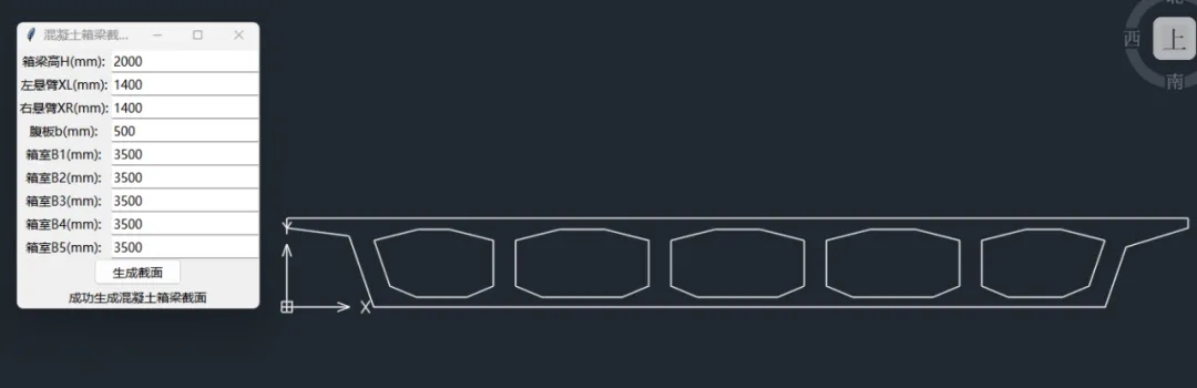 ? ? 武漢市政院實(shí)踐了多模態(tài)技術(shù)融合路徑——依托DeepSeek大模型深度工程語義理解與智能代碼生成框架,將混凝土箱梁截面的幾何參數(shù)標(biāo)準(zhǔn)、CAD二次開發(fā)規(guī)范等專業(yè)知識注入大模型認(rèn)知體系,使其生成代碼框架。經(jīng)過多輪調(diào)試,開發(fā)出參數(shù)化生成混凝土箱梁截面的小插件,能夠?qū)崿F(xiàn)箱梁高度、懸臂長度、腹板寬度、箱室寬度等參數(shù)的設(shè)定,并配備可視化界面。