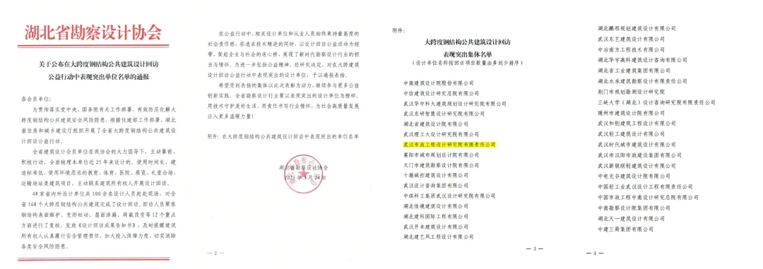 近日,湖北省勘察設計協(xié)會發(fā)布《關于公布在大跨度鋼結構公共建筑設計回訪公益行動中表現(xiàn)突出單位名單的通報》,武漢市政院憑借高度的社會責任感與卓越的專業(yè)貢獻,榮列通報表揚名單,成為全省勘察設計行業(yè)的標桿典范。