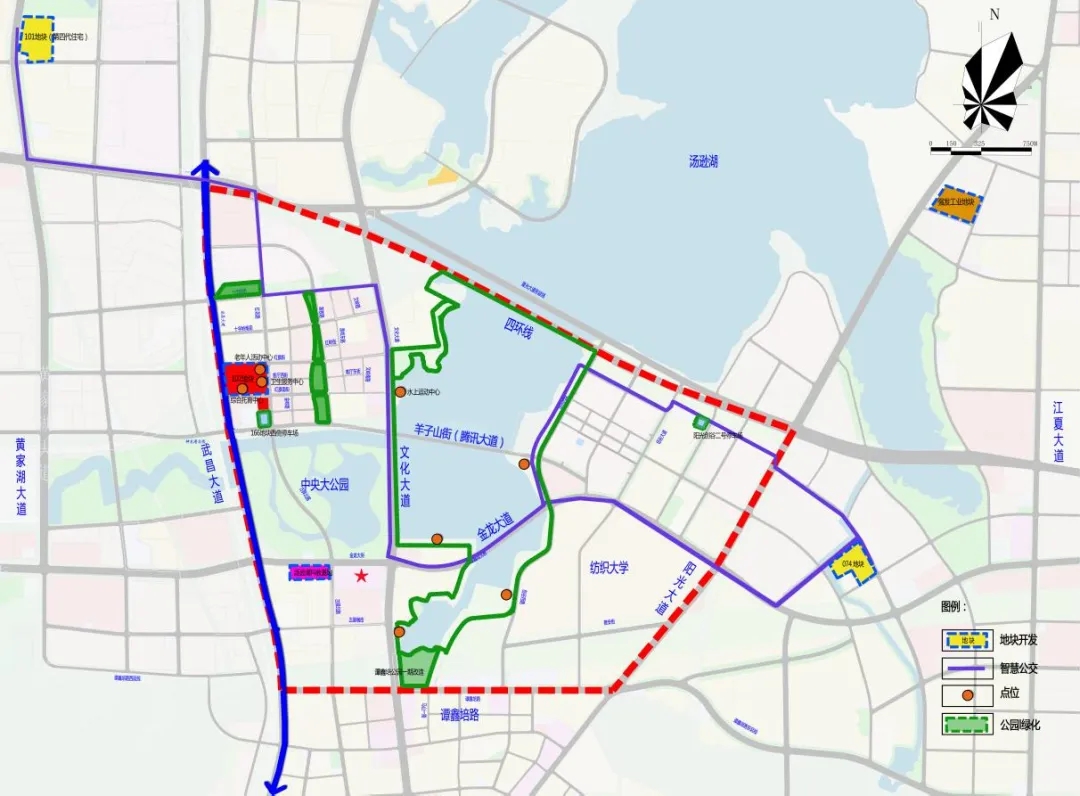 項(xiàng)目核心區(qū)范圍北起四環(huán)線,南抵譚鑫培路,西至武昌大道,東達(dá)陽(yáng)光大道,規(guī)劃區(qū)域面積10.65㎞²(含水域2.2㎞²),研究范圍更延伸至區(qū)界、廟山大道、紙坊大街、黃家湖大道及區(qū)界圍合形成的廣闊區(qū)域。
