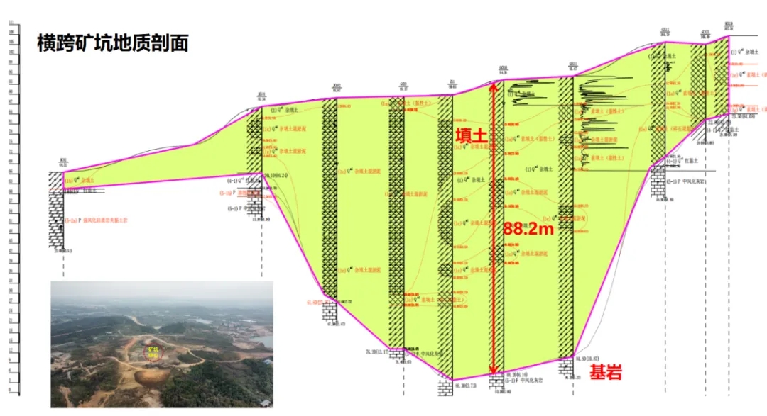 勘察技術(shù)團(tuán)隊(duì)構(gòu)建立體式多源融合的勘察測(cè)試體系,將地質(zhì)調(diào)繪、鉆探取樣、地面沉降監(jiān)測(cè)、物探測(cè)試、水文試驗(yàn)、原位測(cè)試(載荷試驗(yàn)、旁壓試驗(yàn)、十字板剪切、靜探、動(dòng)探、標(biāo)貫等)、高承壓地下水監(jiān)測(cè)、土壤及有害氣體檢測(cè)等手段“一網(wǎng)打盡”,像醫(yī)生為病人做“全身檢查”般,全方位評(píng)估“超深礦坑填方+巖溶”地質(zhì)體的工程特性,持續(xù)追蹤地面沉降、滑坡、巖溶、地下水承壓、水土氣污染等潛在風(fēng)險(xiǎn),為后續(xù)地基基礎(chǔ)設(shè)計(jì)、建筑物平面布局提供扎實(shí)數(shù)據(jù)支撐。