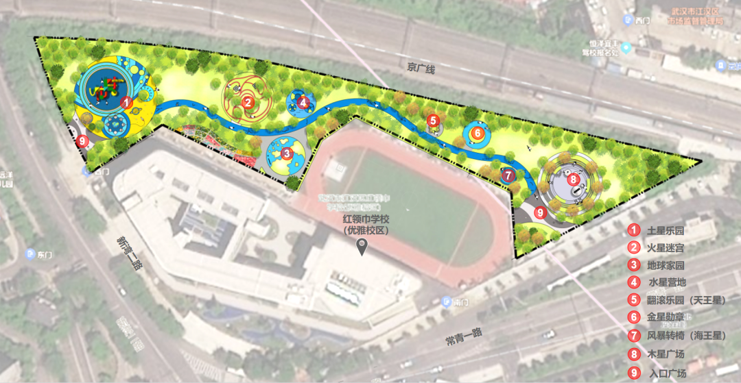 設(shè)計(jì)超有巧思!公園以“泡泡星球”為主題,用大大小小的圓形構(gòu)建出太空漫游般的場景。一條主園路帶你一口氣打卡八大星球景點(diǎn):