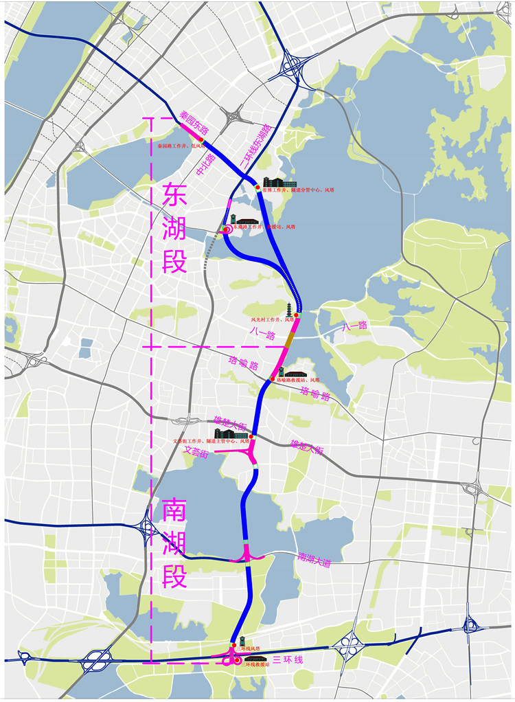 兩湖隧道工程北接秦園路和東湖路,南連三環(huán)線,分為東湖段、南湖段,全長約19公里。兩湖隧道采用“隧-路-隧”的總體建設(shè)方式,隧道內(nèi)設(shè)計為上、下兩層,分別行駛不同方向的車輛,節(jié)約了用地、減少拆遷成本。南湖段盾構(gòu)直徑為15.5米,超大直徑設(shè)計居國內(nèi)之首,是國內(nèi)最長、世界規(guī)模最大的城市湖底雙層隧道。