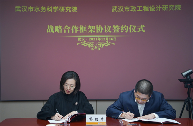 武漢市水務(wù)科學(xué)研究院副院長(zhǎng)李敏與武漢市政設(shè)計(jì)院副總經(jīng)理饒世雄分別代表雙方在戰(zhàn)略合作協(xié)議上簽字。