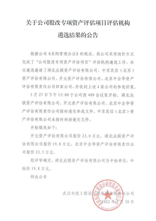 關于公司股改專項資產評估項目評估機構遴選結果的公告