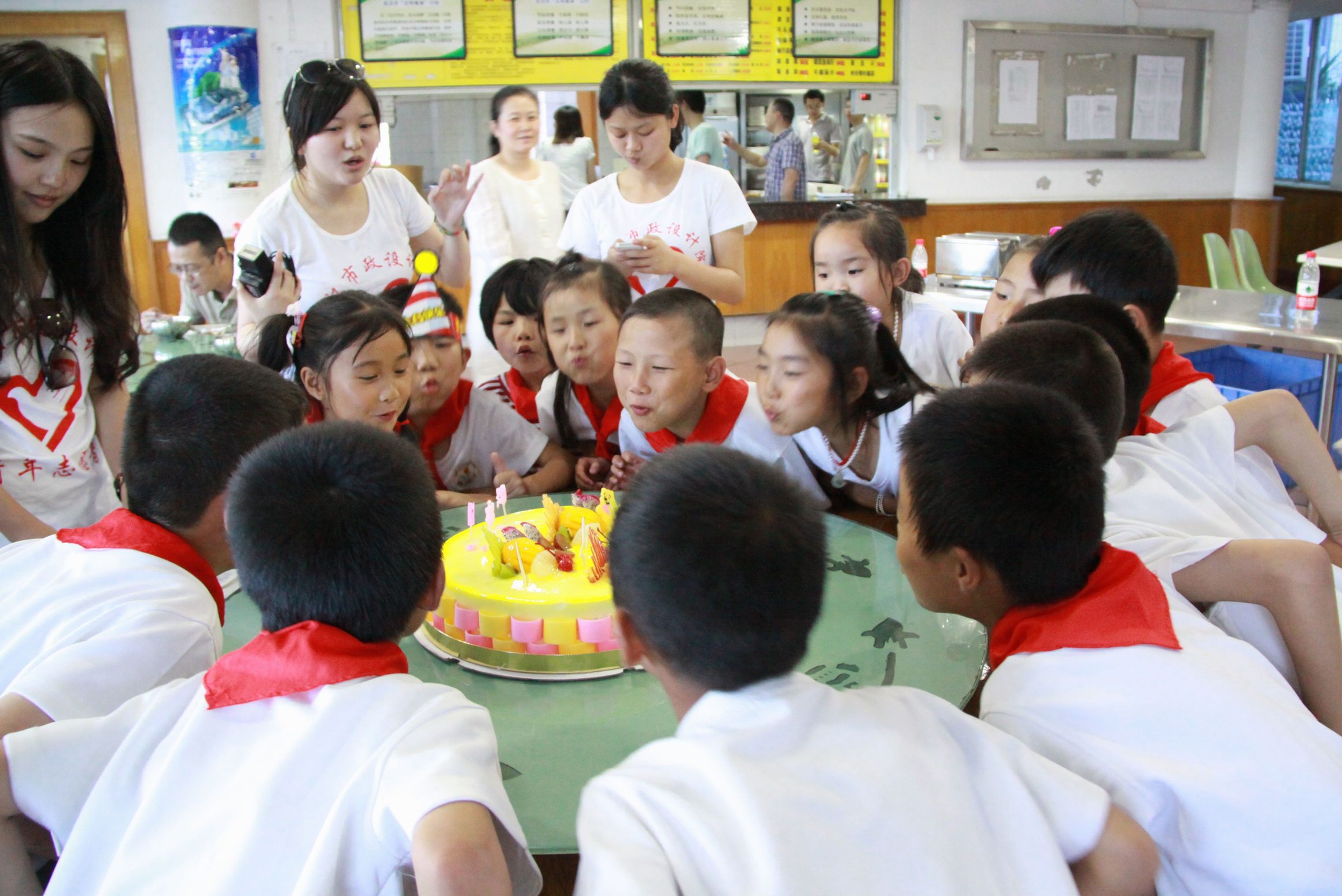 ??? 結(jié)束了一天的行程,志愿者與孩子們回到公司吃晚飯,孩子們有秩序的排隊領(lǐng)取晚餐,吃的干干凈凈。這時,志愿者們端出了準備好的蛋糕,為這群7-9歲的孩子們過一個集體生日,大家唱著生日歌,一起吹滅了蠟燭。志愿者們將蛋糕分發(fā)給每一個孩子,他們吃的津津有味。