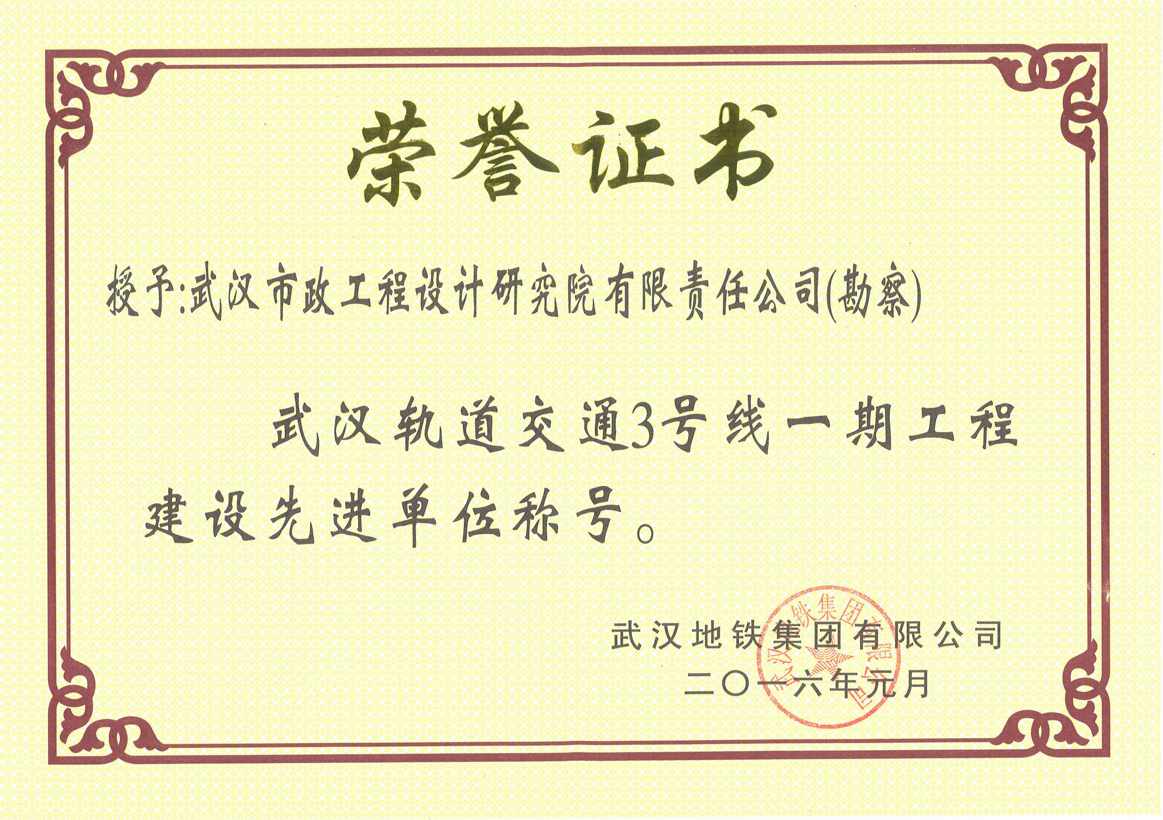 ??? 近日,武漢地鐵集團(tuán)有限公司頒發(fā)文件,表彰一批在武漢軌道交通三號線一期工程建設(shè)中表現(xiàn)優(yōu)異的先進(jìn)單位。公司由于參與并圓滿完成了三號線一期工程的勘察及部分站點(diǎn)和區(qū)間的設(shè)計(jì)工作,榮獲“先進(jìn)單位”榮譽(yù)稱號。