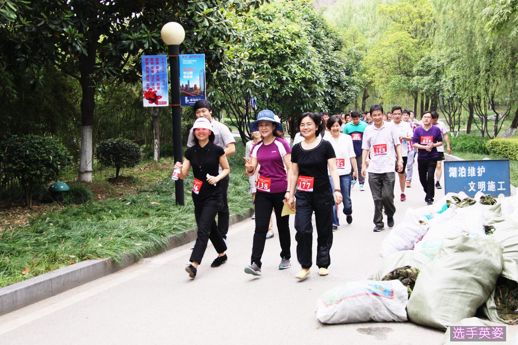 ??? 徒步線路沿后襄河公園而設,參賽隊員按照自己的節(jié)奏進行比賽,有的一馬當先,早早脫離大部隊獨自領跑;有的則跑跑走走,合理分配體力;還有的干脆三兩成群漫步而行,在比賽中體會行走健身的樂趣。在比賽沿途,路旁有綠樹,湖中有秀水,行走在如畫美景中,也緩解了參賽員工身體上的疲勞。