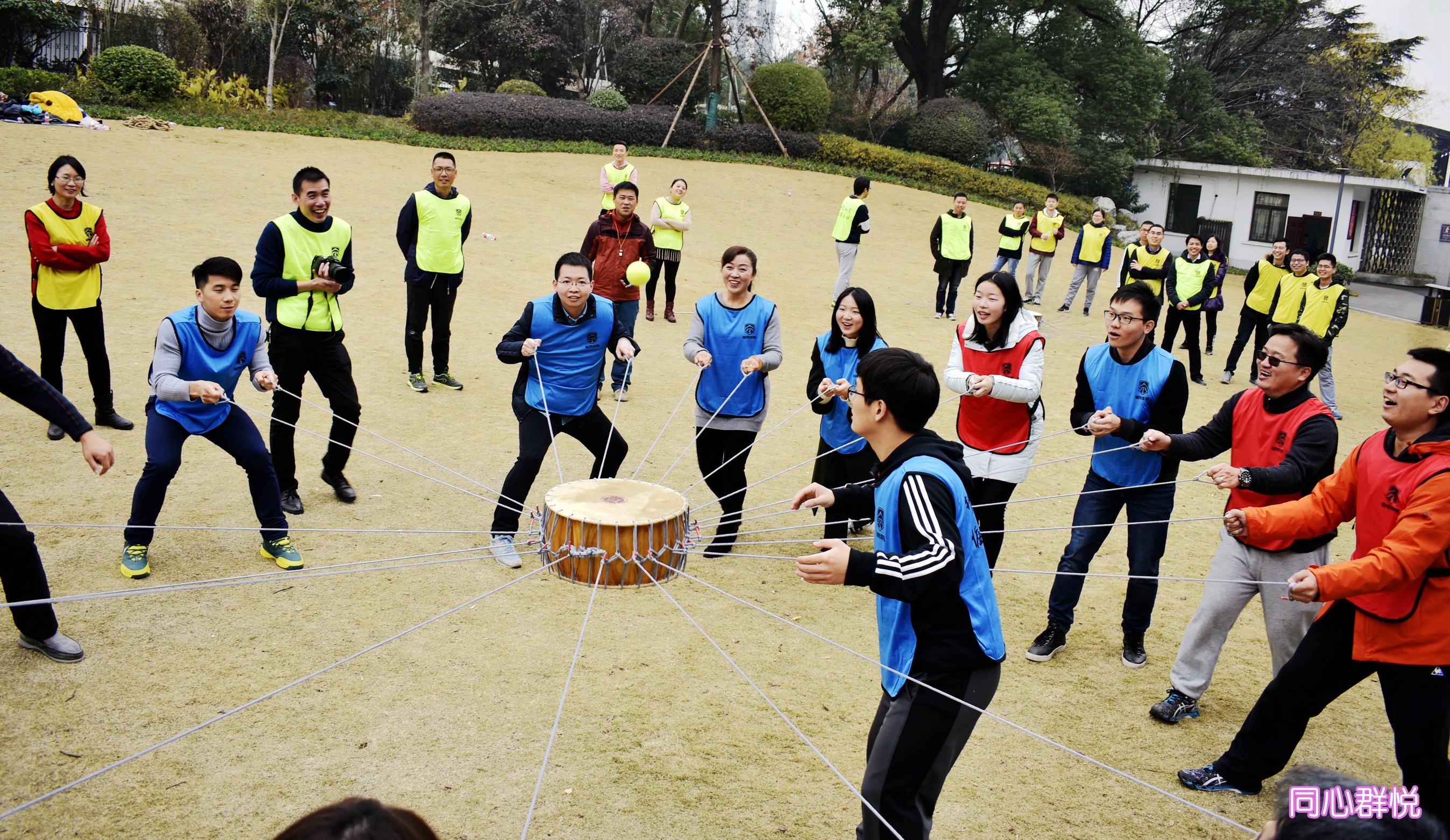 ??? 簡(jiǎn)單的破冰游戲后,所有參與活動(dòng)的人員被分成四支隊(duì)伍,本著“友誼第一,比賽第二”的精神進(jìn)行了多種趣味項(xiàng)目的比拼:團(tuán)隊(duì)展示,隊(duì)員們要在五分鐘內(nèi)確定隊(duì)名、隊(duì)呼和隊(duì)形展示;同心群悅,全體隊(duì)員共同牽動(dòng)繩索控制鼓面,五分鐘內(nèi)獲取盡可能多的顛球次數(shù);呼吸的力量,由三男四女共同利用道具拼成七個(gè)進(jìn)氣孔、一個(gè)出氣孔的呼吸機(jī),并利用呼吸機(jī)吹破五個(gè)氣球;公主撕名牌,由四名女生扮演公主并挑選四名男生作為騎士分成四隊(duì)進(jìn)行相互撕名牌游戲;碰碰球,由公司和社保處各出五男五女共十人進(jìn)行接力碰碰球?qū)埂?/p>