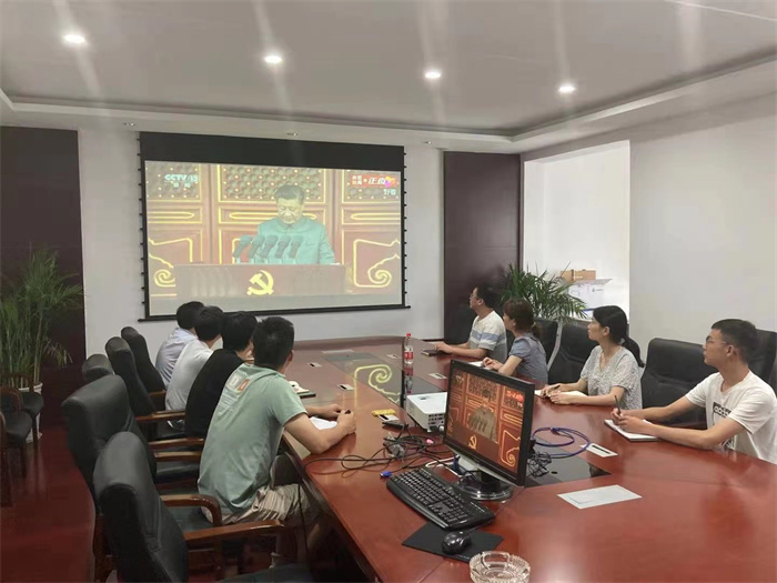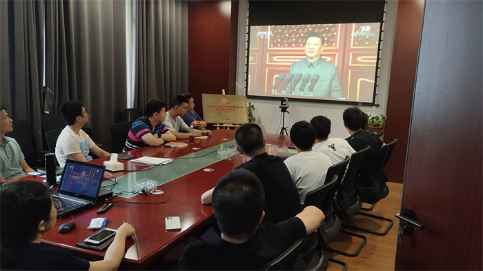 公司領(lǐng)導(dǎo)、總經(jīng)理助理、駐總院辦公的部門負(fù)責(zé)人、支部書記在西四樓會(huì)議室集中收看大會(huì)盛況。大會(huì)伊始,在轟鳴的禮炮聲中,國(guó)旗護(hù)衛(wèi)隊(duì)護(hù)衛(wèi)國(guó)旗颯爽登場(chǎng);全場(chǎng)肅立高唱《國(guó)歌》,高亢的旋律瞬間營(yíng)造了莊嚴(yán)肅穆的氛圍;少先隊(duì)員和共青團(tuán)聯(lián)合獻(xiàn)詞,回顧黨的光輝歷史,表達(dá)對(duì)黨的熱愛與忠誠(chéng)。大會(huì)現(xiàn)場(chǎng)氣氛莊嚴(yán),激昂奮進(jìn),讓收看的人仿佛置身現(xiàn)場(chǎng),親臨盛典。