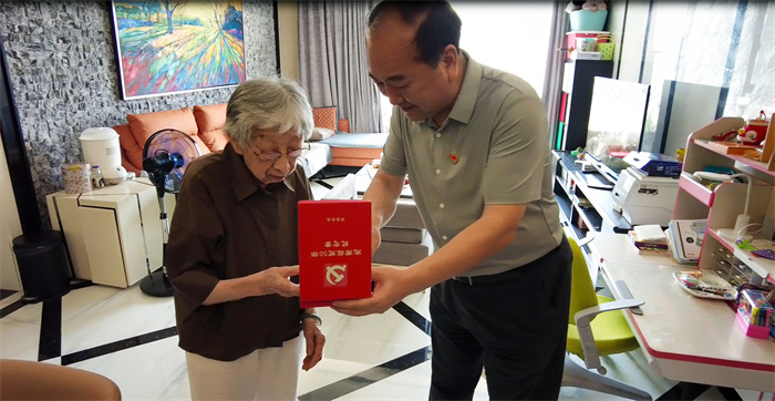 公司黨委書(shū)記、董事長(zhǎng)武興治來(lái)到離休老黨員陶潛的家中,為她佩戴“光榮在黨50年”紀(jì)念章,并送上慰問(wèn)金。武興治親切詢(xún)問(wèn)了陶老的身體和生活狀況,感謝她為公司發(fā)展做出的突出貢獻(xiàn),叮囑她保重身體,尤其要注意防暑降溫,并祝愿她健康長(zhǎng)壽。