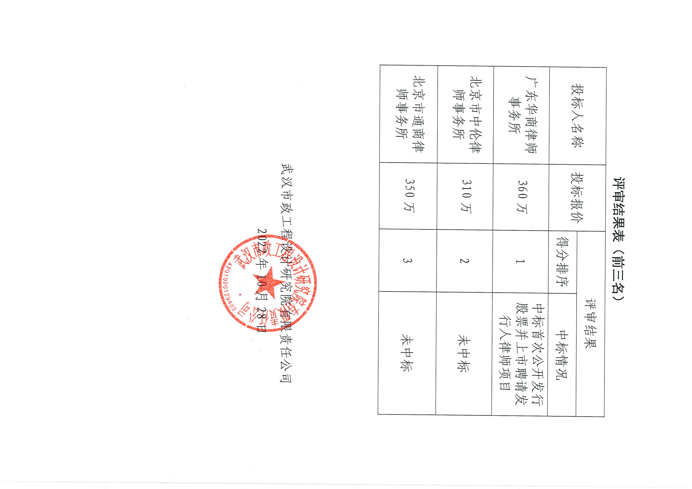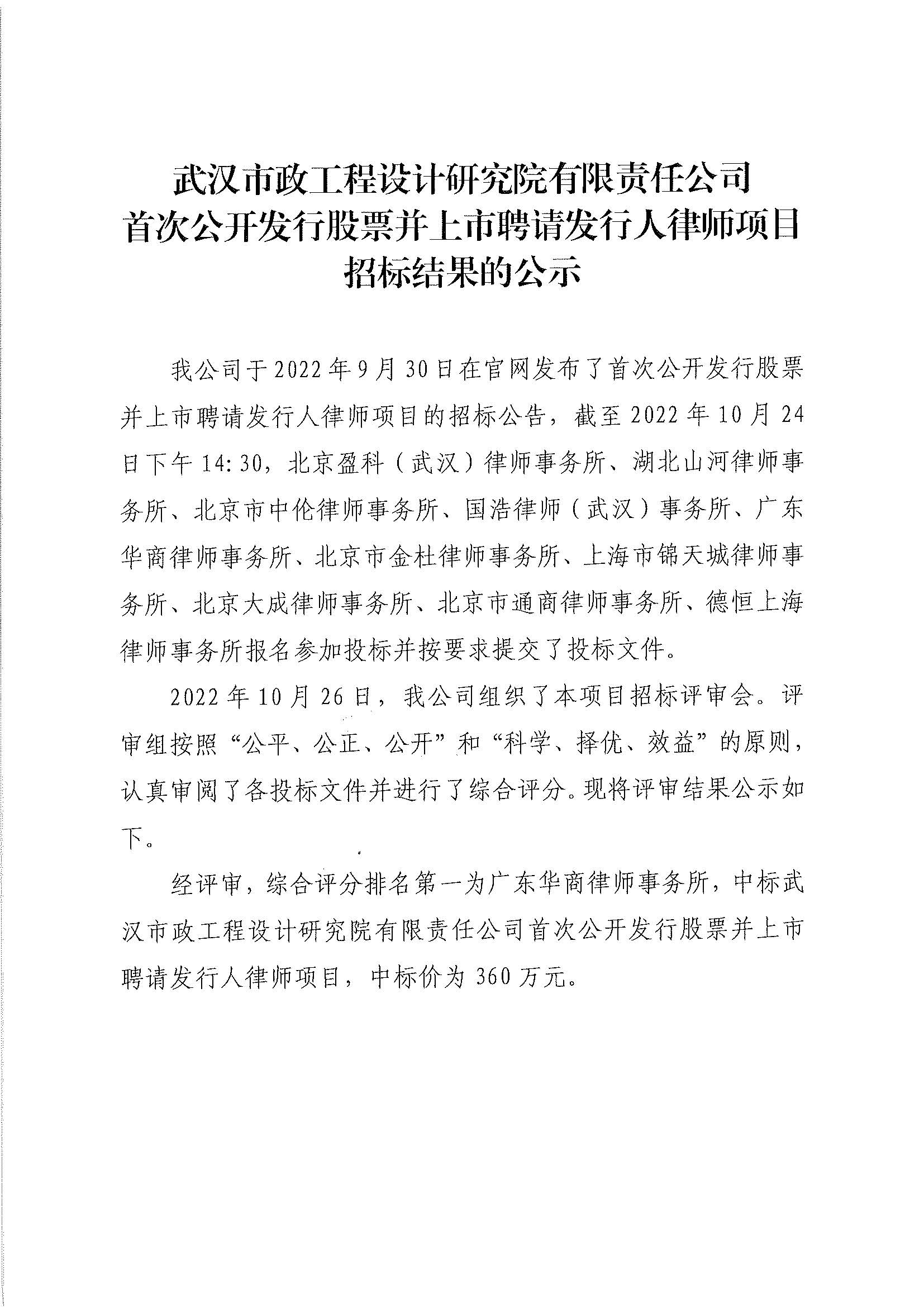 武漢市政工程設(shè)計(jì)研究院有限責(zé)任公司首次公開發(fā)行股票并上市聘請(qǐng)發(fā)行人律師項(xiàng)目招標(biāo)結(jié)果的公示