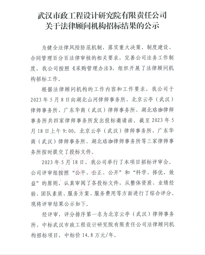 武漢市政工程設計研究院有限責任公司關于法律顧問機構招標結(jié)果的公示