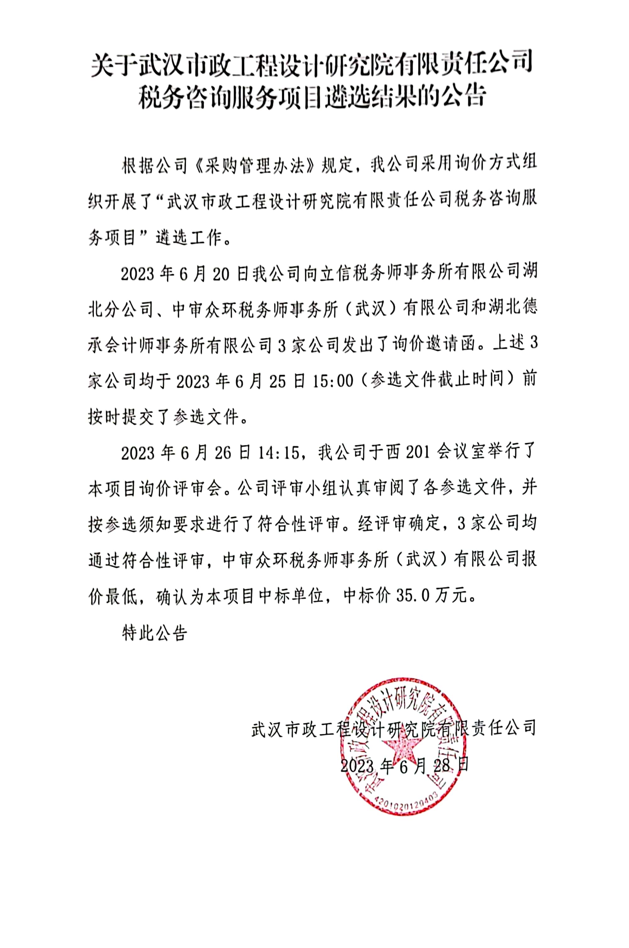 關(guān)于武漢市政工程設(shè)計(jì)研究院有限責(zé)任公司稅務(wù)咨詢服務(wù)項(xiàng)目遴選結(jié)果的公告